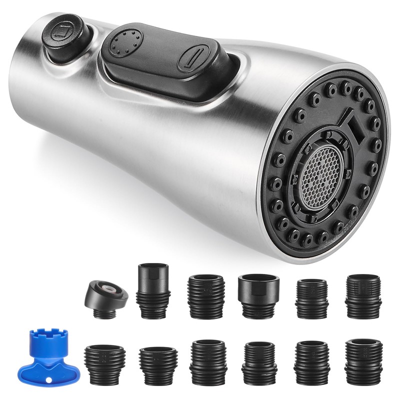 - 12 Faucet Adapter Kit: The kitchen sink sprayer replacement comes with 12 adapters for various connections that is compatible with 99% American Standard kitchen faucet with pull down sprayer and adapt to different cleaning tasks with their three function kitchen sink sprayer.