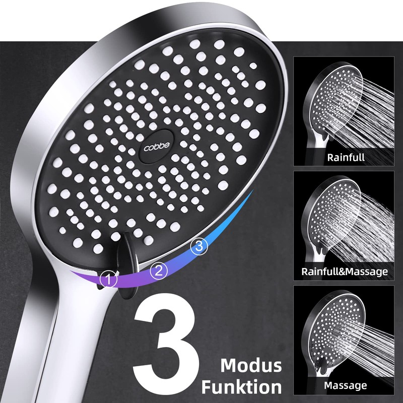 Cobbe Shower Head Water Saving Shower Head Large Rain Shower Head Pressure Increasing Water Saving Shower Head with 3 Jet Types Black/Chrome