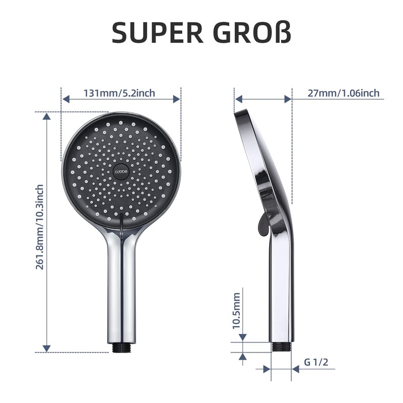- Extra Large Size The large shower head with 5.2 inch diameter and the inclined nozzle at 15 degrees, which provides a larger shower area for the ultimate shower experience. Suitable for most G1/2 showers.