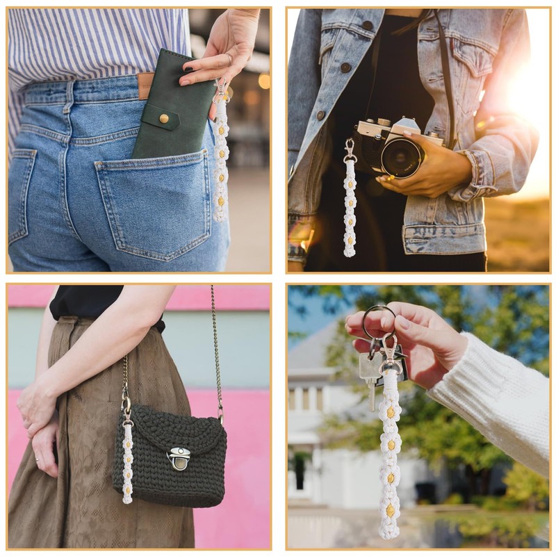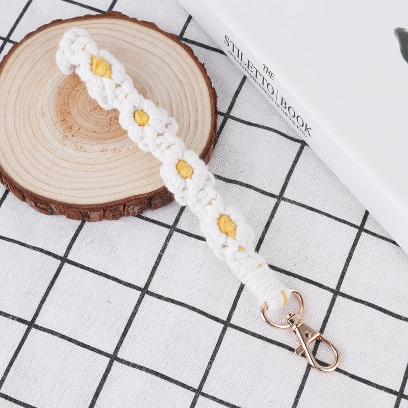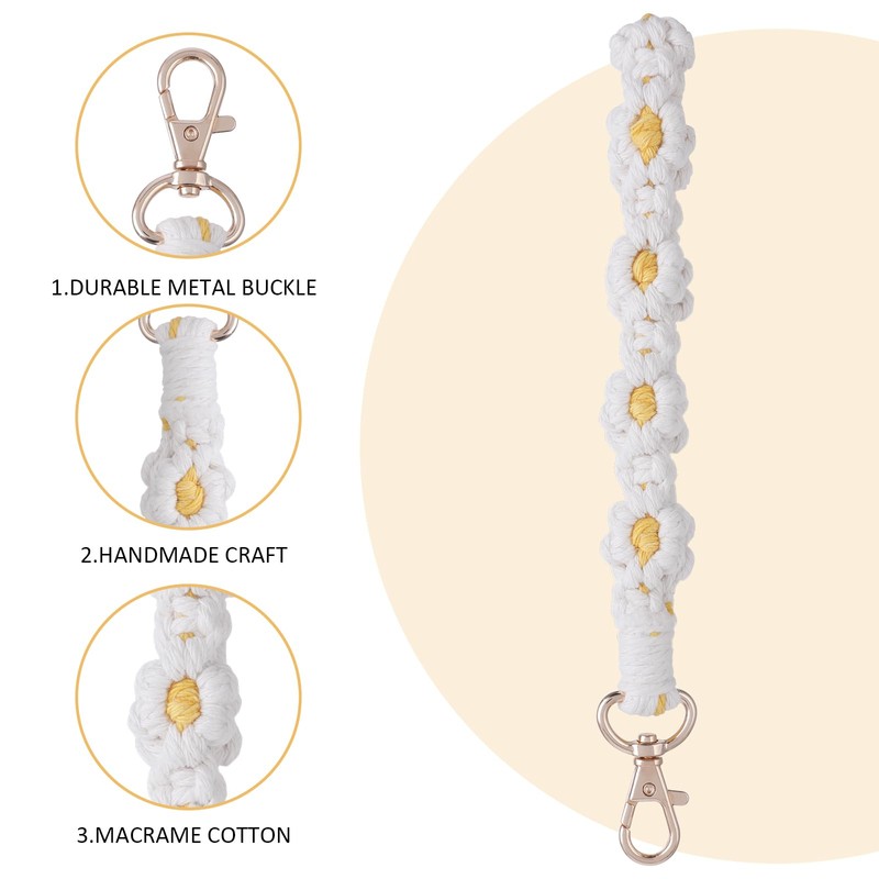cobee Daisy Macrame Keychain, Handmade Boho Macrame Keychain Holder Macrame Keychain Bracelet Colorful Bracelet Keychain (White), White