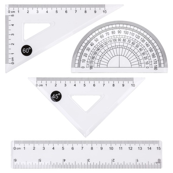 - 【Complete Math Tool Set】You will be provided with 1pcs 6 inch/ 15 cm straight ruler, 1 triangle ruler at 45-degree, 1 triangle ruler at 60 degrees, and 1pcs 4 inches 180 protractors, a total of 4 pieces. The complete combination meets the needs of various occasions, you can choose the right ruler to work according to your needs.