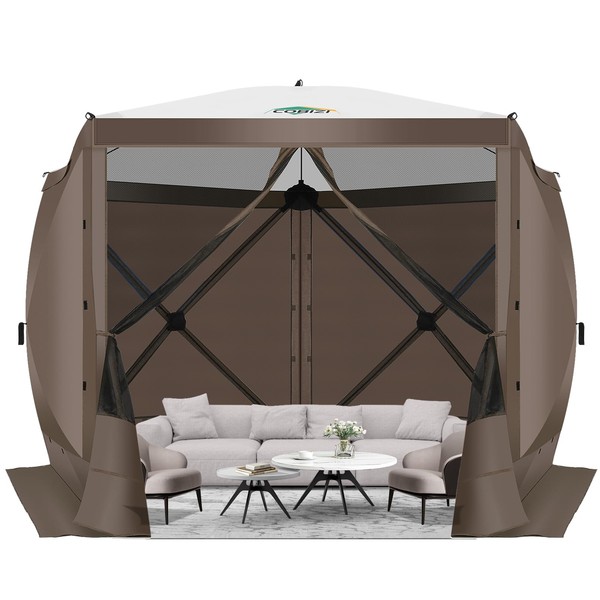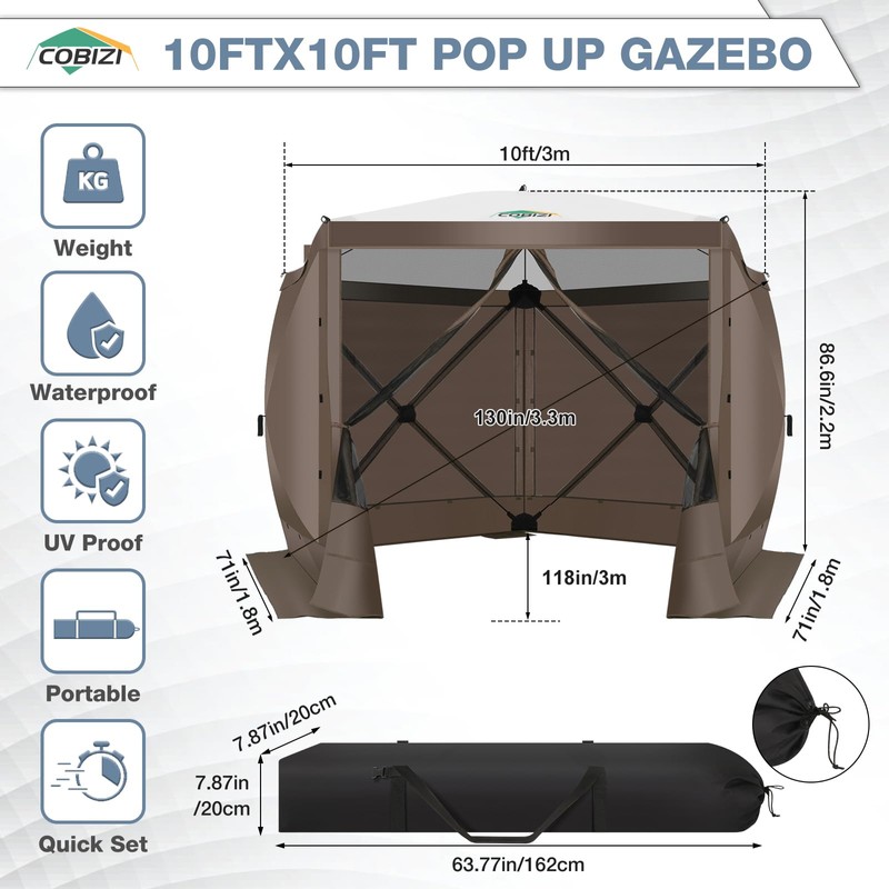 COBIZI Pop Up Gazebo Screen Tent Screen House for Camping, 10FTx10FT Screen Room with Mosquito Netting, Hub Tent Instant Screened Canopy with Carrying Bag and Ground Stakes, Brown