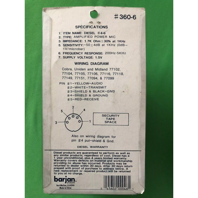 Barjan Diesel Electronics Premium Amplified Power Microphone #360-6 with 5 pin locking male din plug fits: Cobra, Uniden & several Midland see the back of the package for additional information. For more details please refer to the pictures or if you have any questions please feel free to email me.