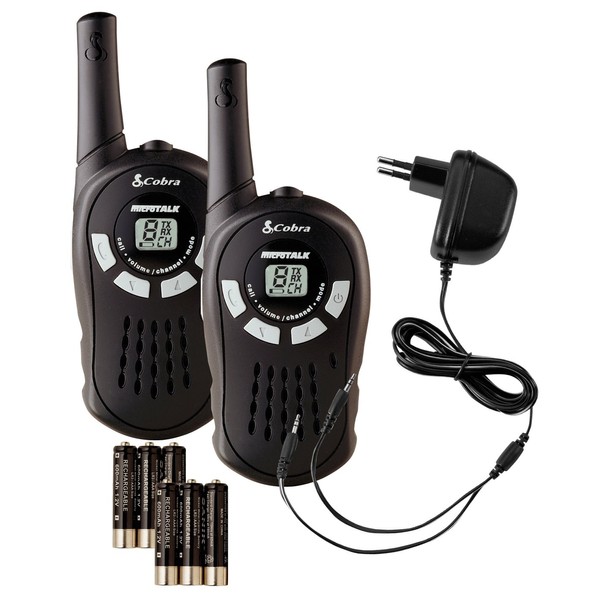 - The MT 200 Walkie Talkies from Cobra have a range of up to 5 km, depending on the terrain and conditions, so you can chat with friends from almost anywhere. The MT 200 Walkie Talkies each have 8 channels, a belt clip, Call Alert and Roger Beep functions, and are really easy to use. They use 3 rechargeable AAA batteries, and let you communicate instantly around the house and garden... or even further afield!