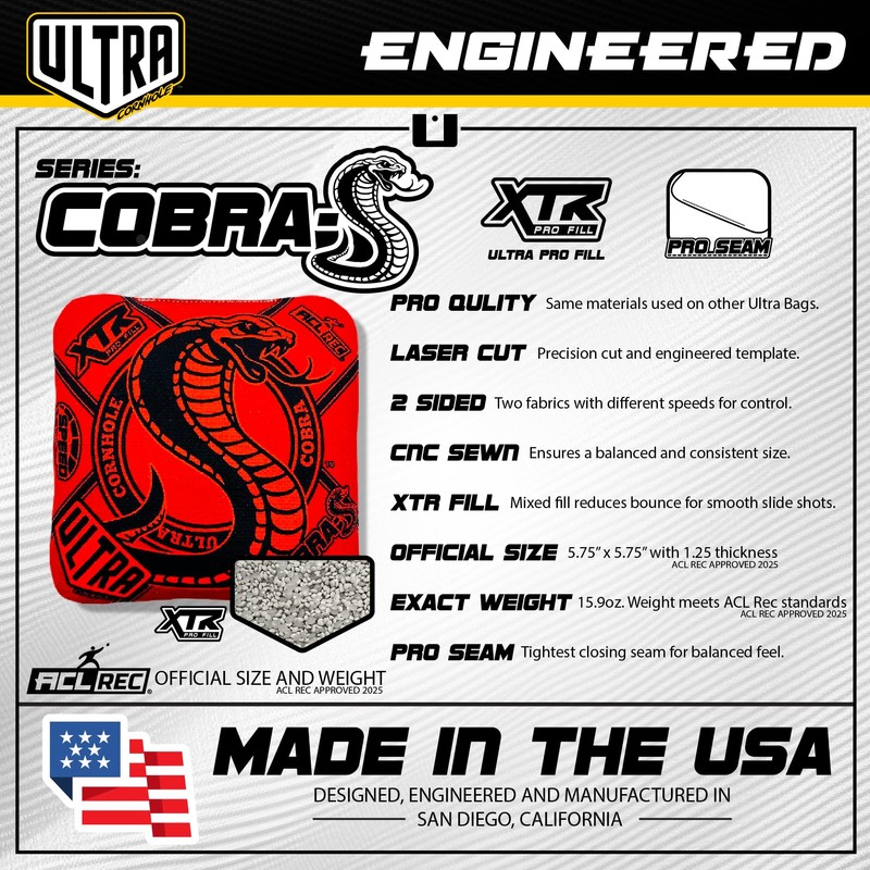 - Set of 4 quality Ultra Cornhole Bags at an entry level price: Ultra Cornhole's Cobra-S is the ideal bag for players in every stage of the game. Whether camping with friends or warming up for an upcoming ACL tournament, these bags get the job done.