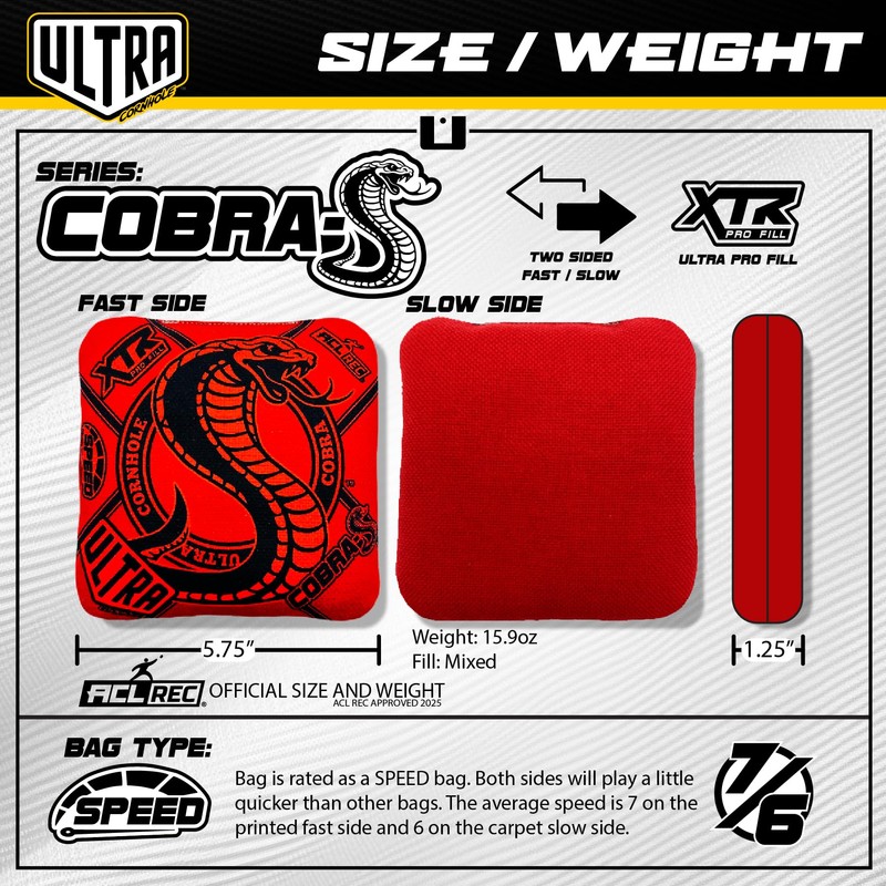 - Two different fabrics: Ultra Cornhole's Cobra-S bags utilize two unique fabrics to optimize game play. When the environment is hot and bags are sliding off your boards, throw with the slow side down to enhance stick. Too slow for the winter? Throw fast side down and watch the Cobra-S find the hole.