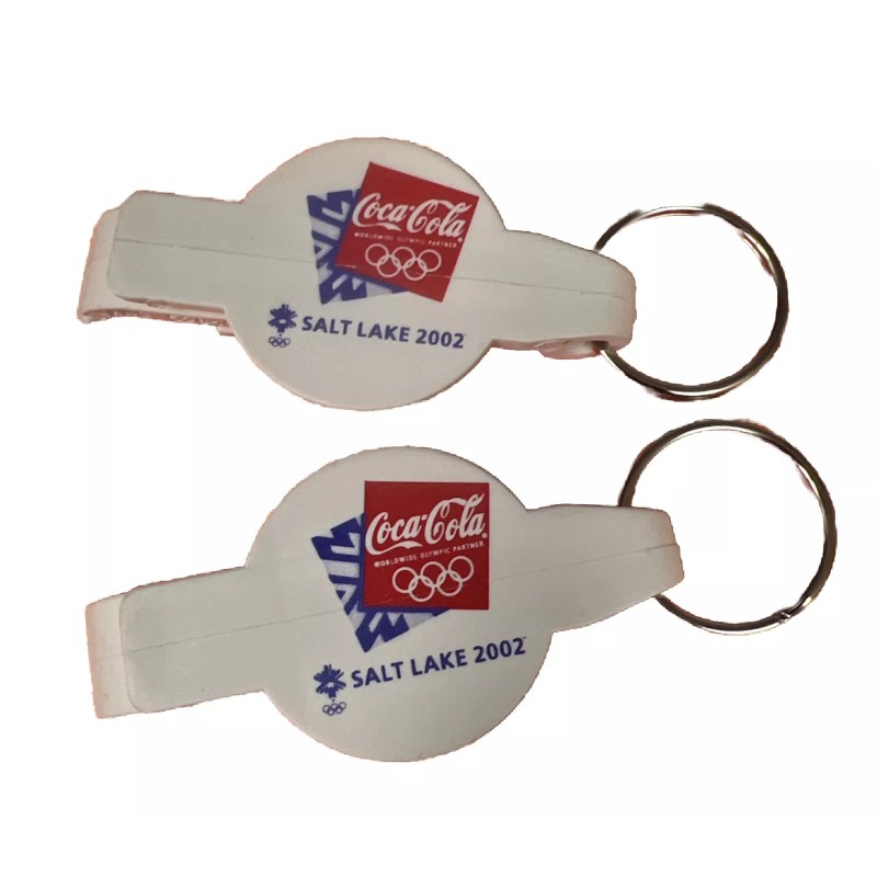 Two Coca Cola Worldwide Olympic Partner 2002 Salt Lake key chain bottle openers. Both are new old stock in mint condition. See photos for best description.