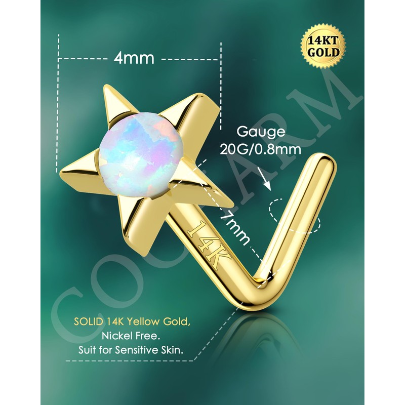 COCHARM 14K Gold Star Nose Stud 20g L Bend Opal Nostril Nose Stud 7mm Long Yellow Gold Nose Piercing 14kt Real Gold Nose Ring Stud Hypoallergenic Solid Gold Nose Stud Piercing Jewelry