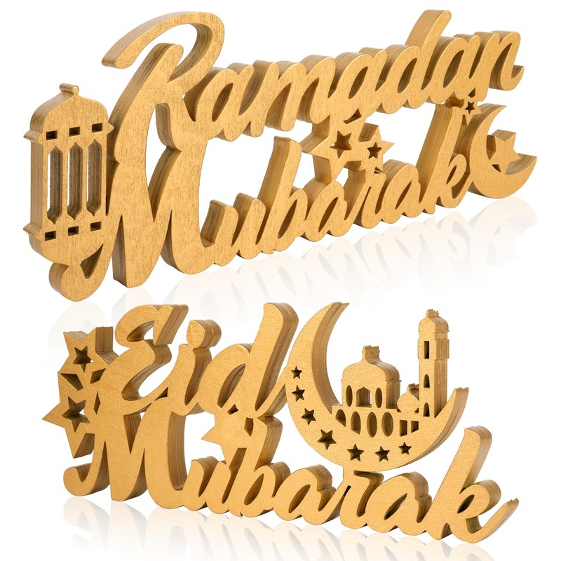 COCHIE 2 Pcs Islamic Tabletop Decors Ramadan Mubarak Wood Sign Eid Mubarak Wooden Table Centerpiece Ramadan Decorations for Home Islamic Home Decor