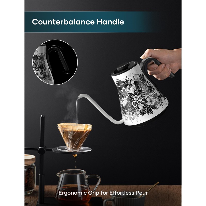 - S-Shaped Spout Design: This design delivers impeccable vertical water flow control and effortlessly accommodates various brewing methods. The anti-slip silicone on the handle ensures a comfortable and secure grip every time.