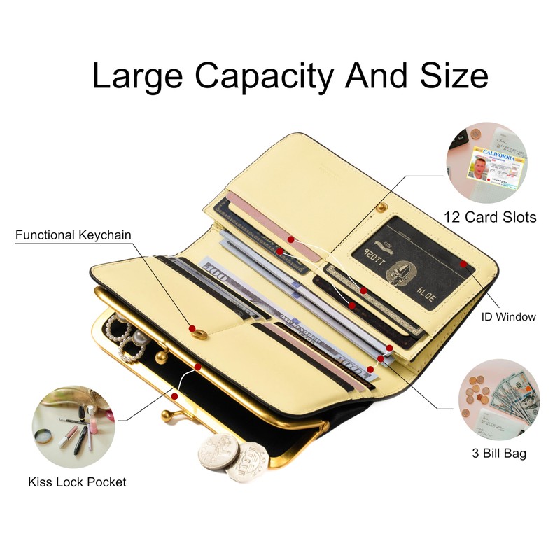 - FUNCTIONAL DESIGN: 11 slots, 9 credit card slots, 1 clear ID card slot and 1 large receipt slot, 2 full-size bill compartments and kiss-lock pockets for coins, keys or other small items, convenient and compact, and easy to open without hurting your hands and protect your nails if you have beautiful long nails. The wallet section closes with a concealed snap and the coin section closes with a kiss-lock.