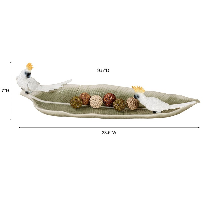 - If you are crazy about Cockatoos, these tropical birds will feather your nest. This resin palm leaf decorative tray features white birds with golden crests and black beaks perched on the edge of a large, green-washed tropical leaf. For decorative use only. Measures 23.5"Wx9.5"Dx7"H. Orbs are not included. This item is our exclusive Features two cute cockatoo birds Tropical palm leaf tray has a green wash Detailed appearance Provides a fun display space for your decorative orbs.