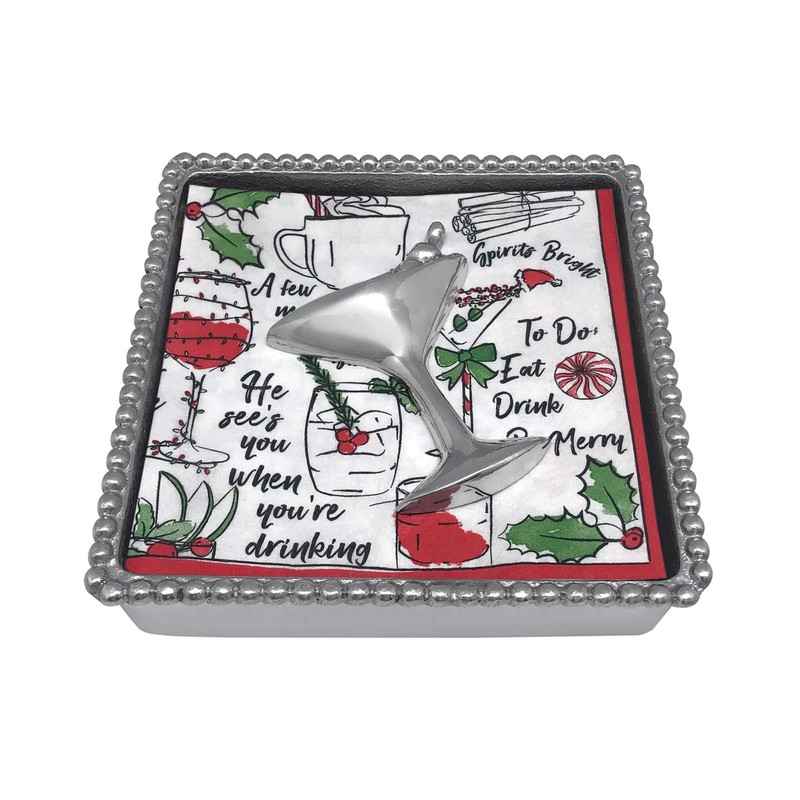 - Includes one Cocktail Beaded Napkin Box, one pack of 20 cocktail napkins and one napkin weight