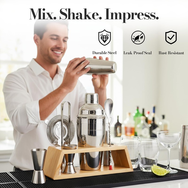 Cocktail Shaker Set Bartender Kit with Bamboo Stand – Professional Martini Shaker, Premium Stainless Steel Shaker Bottle, Complete Bar Accessories Gift Set and Mixology Kit for Home Bar & Drink Mixing