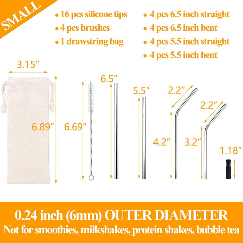 - 【SIZE FOR SHORT GLASSES/CUPS】Our short metal straw set includes: 4pcs straight and 4pcs bend straws at 5.5 inch long, 4pcs straight and 4pcs bent straws at 6.5 inch long(length from tip to tip, 6mm outside diameter, NOT FOR boba/thick drinks), 16pcs silicone tips, 4pcs cleaning brushes and a carrying bag.