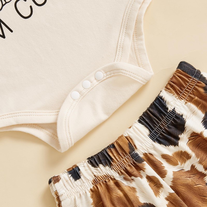- CUTE DESIGNS: Newborn romper baby girl bell bottom outfit, Infant girls clothes; Baby romper uses letter and cow print, long sleeve, bottom snap closure, crew neck design; Elastic waist flare pants with cow pattern print design