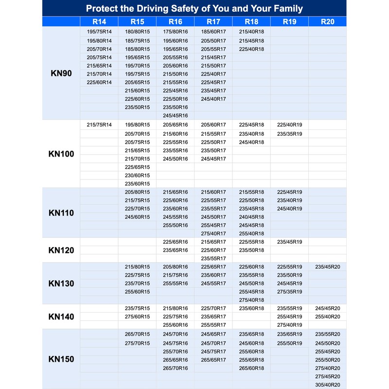 - KN130 anti-skid chains are suitable for the following tire models:205/80R16,215/75R16,215/80R15,225/55R19,225/60R18,225/65R17,225/75R15,235/45R20,235/50R19,235/55R18,235/60R17,235/70R15,245/45R19,245/50R18,245/55R17,255/45R18,255/55R16,255/60R15,275/35R19,275/40R18.If your tires are not included, please let us know.