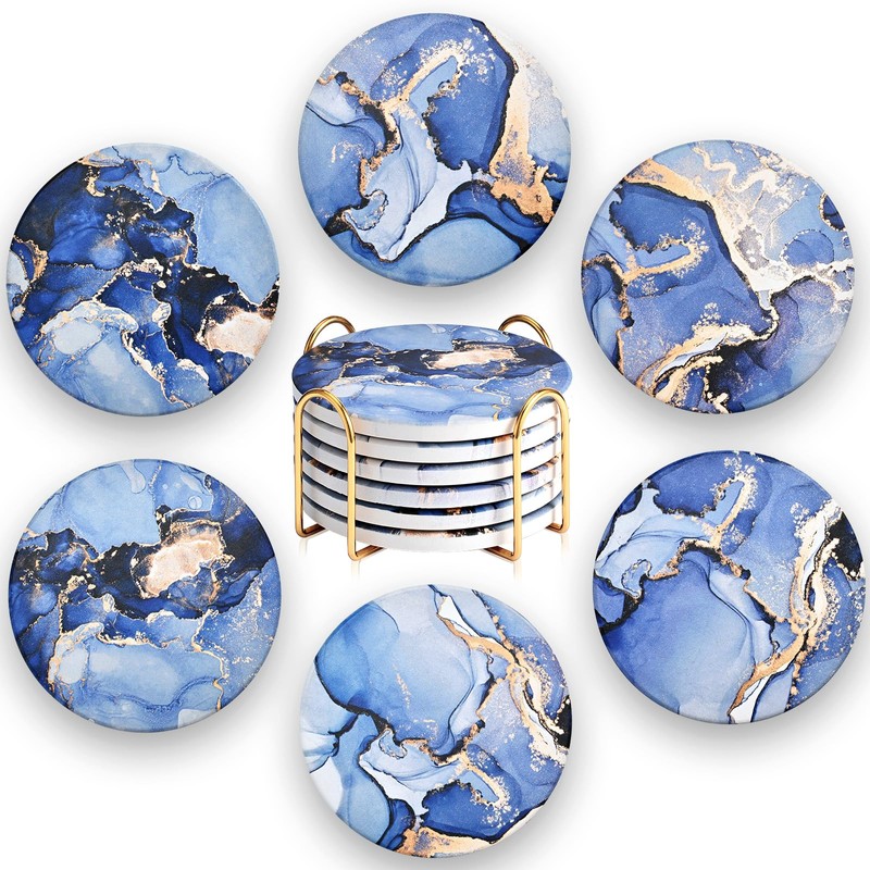 CoColemon Navy Blue Absorbent Coasters Set of 6, Marble Abstract Coaster with Holder, Home Coffee Table Décor for Women, Cute Cork Coasters for Drinks