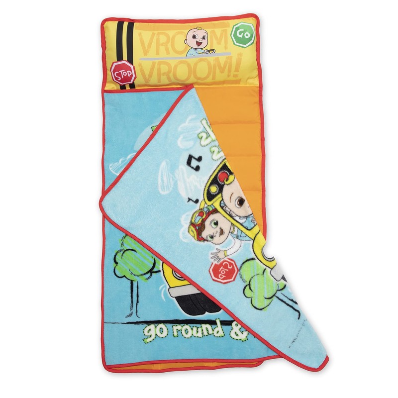 - Cocomelon toddler nap mat, sure to excite your child with bright and colourful design. Large colourful school bus print. “Vroom Vroom” graphic on the attached pillow.