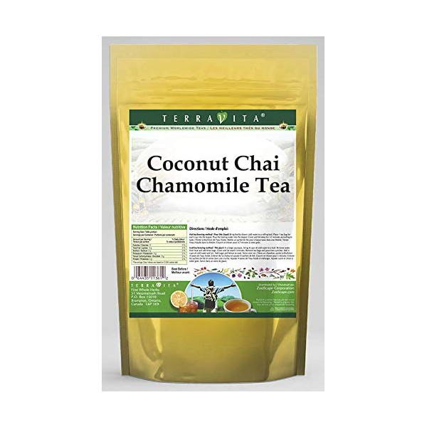 Our Coconut Chai Chamomile Tea is a delicious flavored Chamomile tea with Coconut, Cinnamon Chips and Ginger that you will enjoy relaxing with anytime! The natural Coconut Chai taste is delicious! - Ingredients: Chamomile tea, Coconut, Cinnamon Chips, Ginger and Natural Coconut Chai Flavor. - Hot tea brewing method: Bring freshly drawn cold water to a rolling boil. Place 1 teabag for each desired cup into the teapot. Pour the boiling water into the pot, cover and let steep for 2-4 minutes. Pour into your cup; add milk and natural sweeteners to taste. - Iced tea brewing method: (to make 1 liter/quart): Place 5 teabags into a teapot or heat resistant pitcher. Pour 1 1/4 cups of freshly boiled water over the teabags. Steep for 5 minutes. Quarter fill a serving pitcher with cold water. Pour the tea into the serving pitcher. Add ice and top-up with cold water. Garnish and sweeten to taste. - TerraVita is an exclusive line of premium-quality, natural source products that use only the finest, purest and most potent ingredients found around the world. TerraVita is hallmarked by the highest possible standards of purity, potency, stability and freshness. All of our products are prepared with the highest elements of quality control, from raw materials through the entire manufacturing process, up to and including the moment that the bottles or bags are sealed for freshness and shipped out to you. Our highest possible standards are certified by independent laboratories and backed by our personal guarantee. - TerraVita exists to meet and ensure your family's health and wellness without the harmful effects or chemicals and prescription medications. We strive to make all of our products affordable and reliable and are constantly searching the market to maintain our affordability and