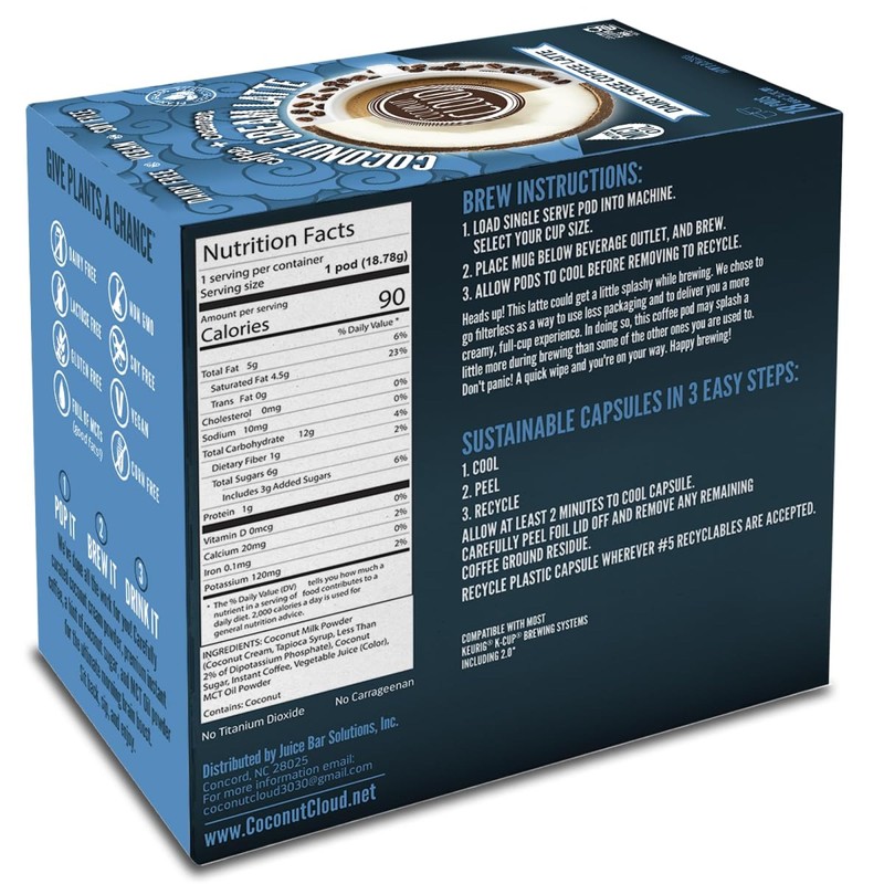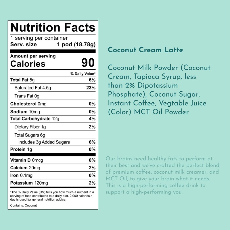 - Each pod contains premium instant coffee, coconut cream powder, coconut sugar, and MCT Oil (to support healthy brains and bodies!).