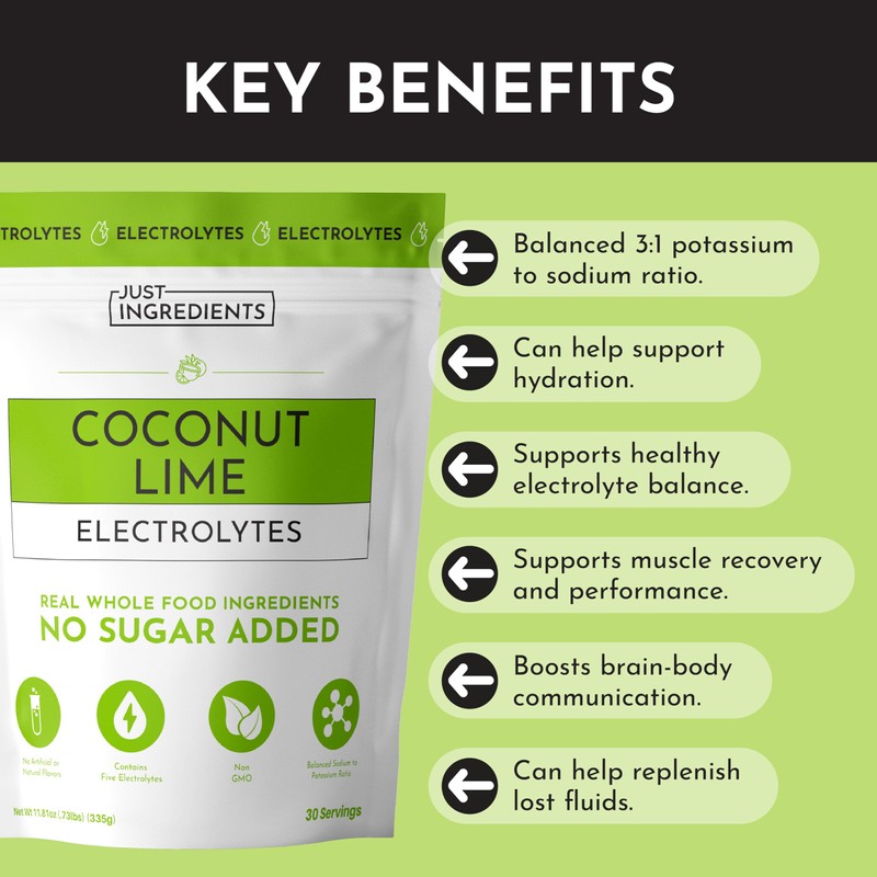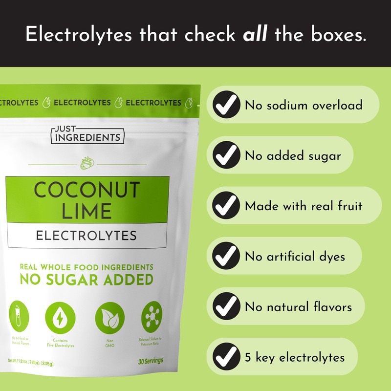 Stay refreshed with Just Ingredients Coconut Lime Electrolytes – a 30‑serving hydration drink mix formulated to support energy, hydration, and mineral replenishment throughout your day.* This tropical-inspired blend includes sea salt, trace minerals, and coconut water to help replace electrolytes lost through sweat, movement, or heat exposure.* It’s ideal for daily use, intense workouts, or staying hydrated on the go. Each serving is sweetened with monk fruit and stevia — no added sugar, no sugar alcohols, and no gums. Real fruit extracts from coconut and lime give the formula a light, clean flavor without artificial dyes or sweeteners. The result: smooth, easy hydration that’s gentle on your system. To use, simply mix one scoop into 12–16 oz of water and enjoy before or after workouts, during travel, or anytime you need clean hydration support. Just Ingredients is a woman‑founded brand focused on transparency, quality, and ingredient integrity. Every formula is third-party tested for purity and label accuracy. Like all our products, Coconut Lime Electrolytes contain no fillers, no artificial flavors, and nothing your body doesn’t need. *These statements have not been evaluated by the Food and Drug Administration. This product is not intended to diagnose, treat, cure, or prevent any disease.