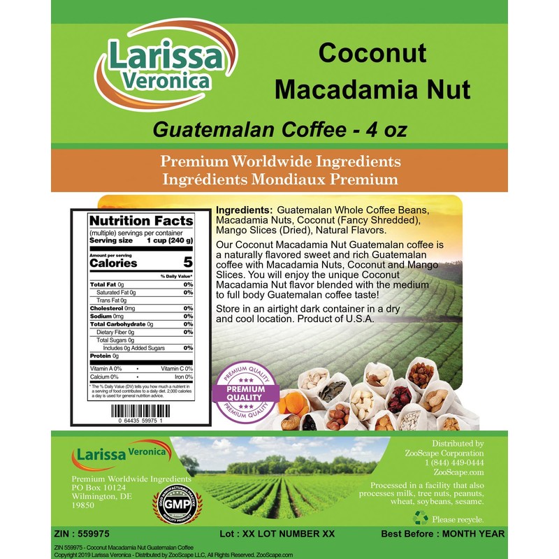 - Our Coconut Macadamia Nut Guatemalan coffee is a naturally flavored sweet and rich Guatemalan coffee with Macadamia Nuts, Coconut and Mango Slices. You will enjoy the unique Coconut Macadamia Nut flavor blended with the medium to full body Guatemalan coffee taste! - Ingredients: Guatemalan coffee (whole coffee beans), Macadamia Nuts, Coconut, Mango Slices and Natural Coconut Macadamia Nut Flavor.