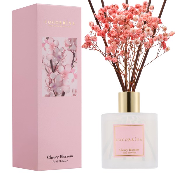 COCORRÍNA Reed Diffuser - Cherry Blossom 6.7 Fl.oz Reed Diffuser Set with Sticks & Preserved Baby's Breath, Reed Diffuser for Home Bathroom Shelf Decor