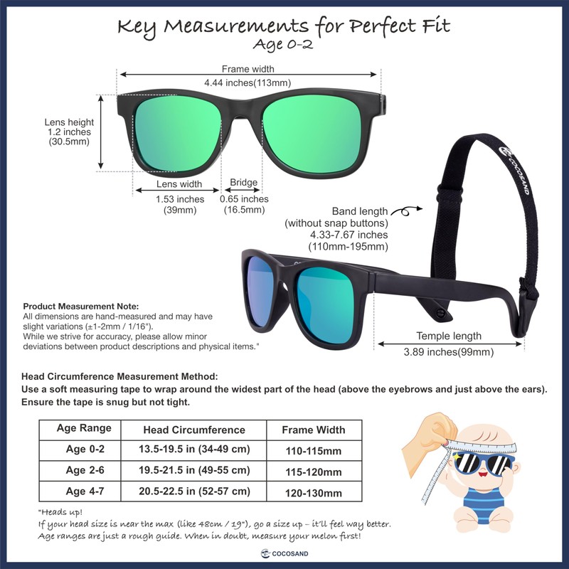 • 【Perfect Fit for Growing Babies】:Our infant sunglasses fit babies with head circumferences up to 48cm. The adjustable temple and 110-195mm strap mean a custom fit for every stage. Whether your baby boy or baby girl is growing fast, these sunglasses grow with them