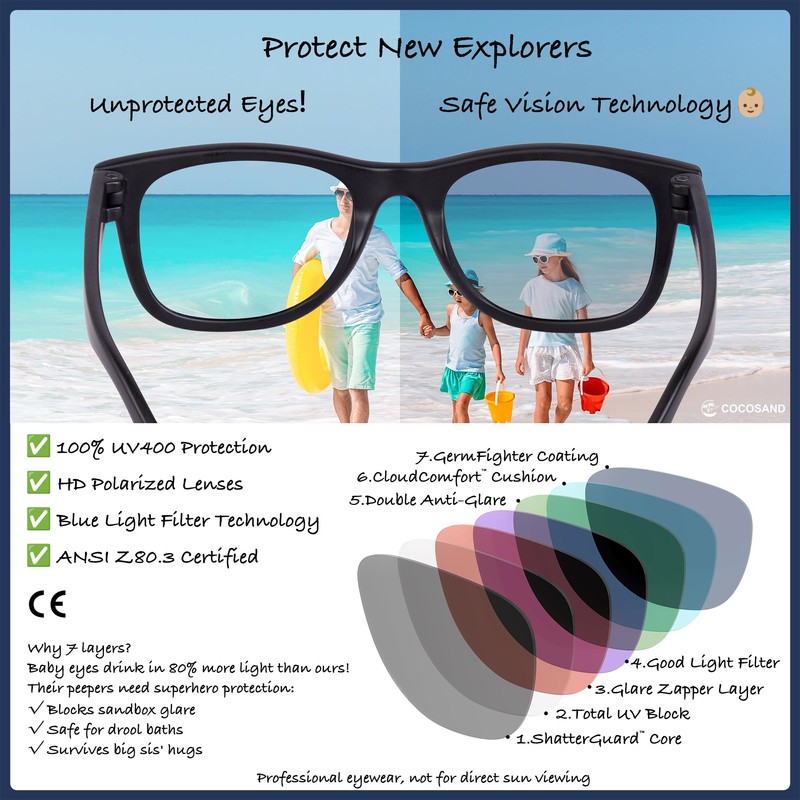 Our polarized lenses are a great feature. They block harmful UV rays, reduce glare, and let your baby see the world in true colors. This protects their eyes and gives them a clear view outdoors.