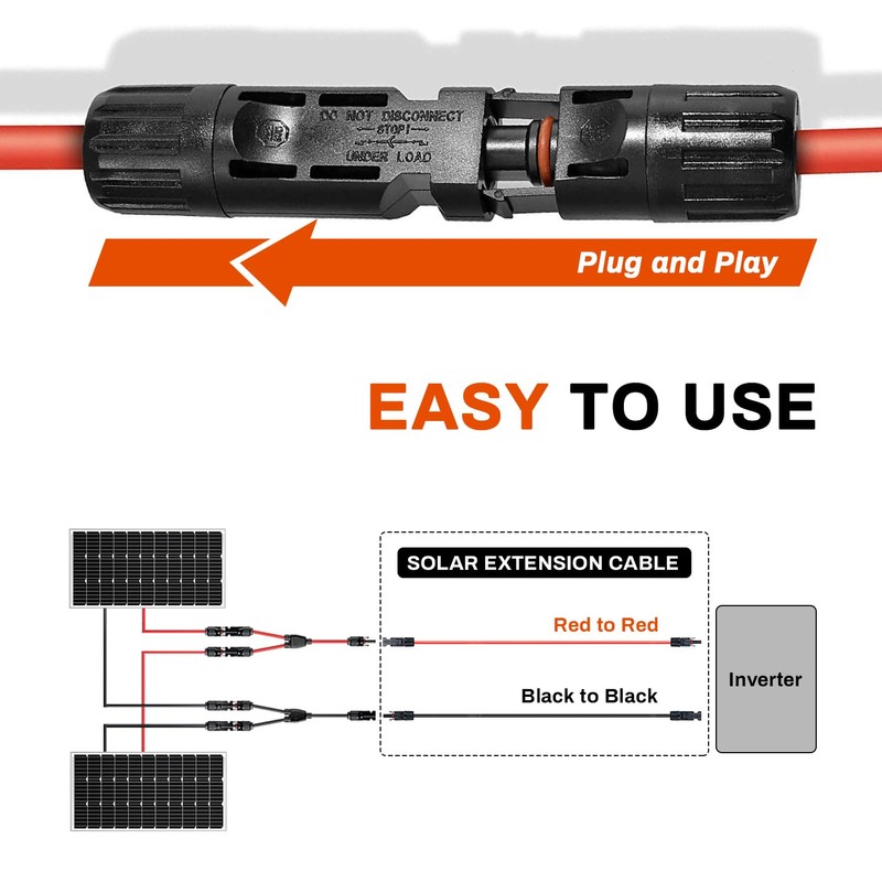 - 🌅【2 Pairs of Connectors - Pre-installed】The solar extension cable comes with two pairs of male and female connectors, pre-installed during the production process. During use, simply insert and remove to quickly complete the connection installation, eliminating additional operations and simplifying the installation procedures, thereby increasing overall efficiency.