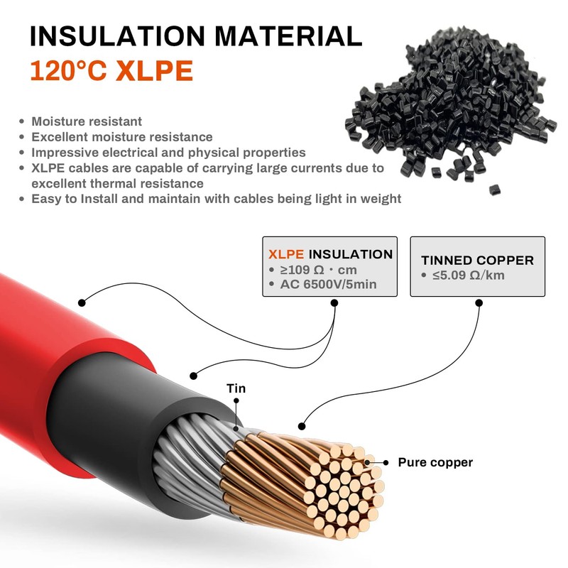 - 🌅【High-Quality Materials】The 12AWG/4mm² 10AWG/6mm² solar connection cable is made with XLPE (cross-linked polyethylene) insulating material, with an insulating sheath of 0.8 mm and a protective sheath of 0.8 mm, and a 12AWG/4mm² 10AWG/6mm² tinned copper conductor. The quality of the materials gives the cable excellent aging resistance, high-temperature resistance, and good conduction performance.