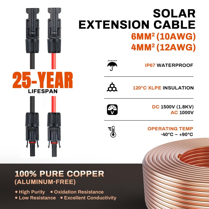 - 🌅【Suitable for Various Situations】The 12AWG/4mm² 10AWG/6mm²solar extension cable can be used on roofs, caravans, boats, cars, and for various outdoor solar projects, such as mobile photovoltaic generators, solar stations on balconies, portable power stations, solar panels, solar power plants, and solar batteries, offering a reliable connection solution for a variety of solar projects.