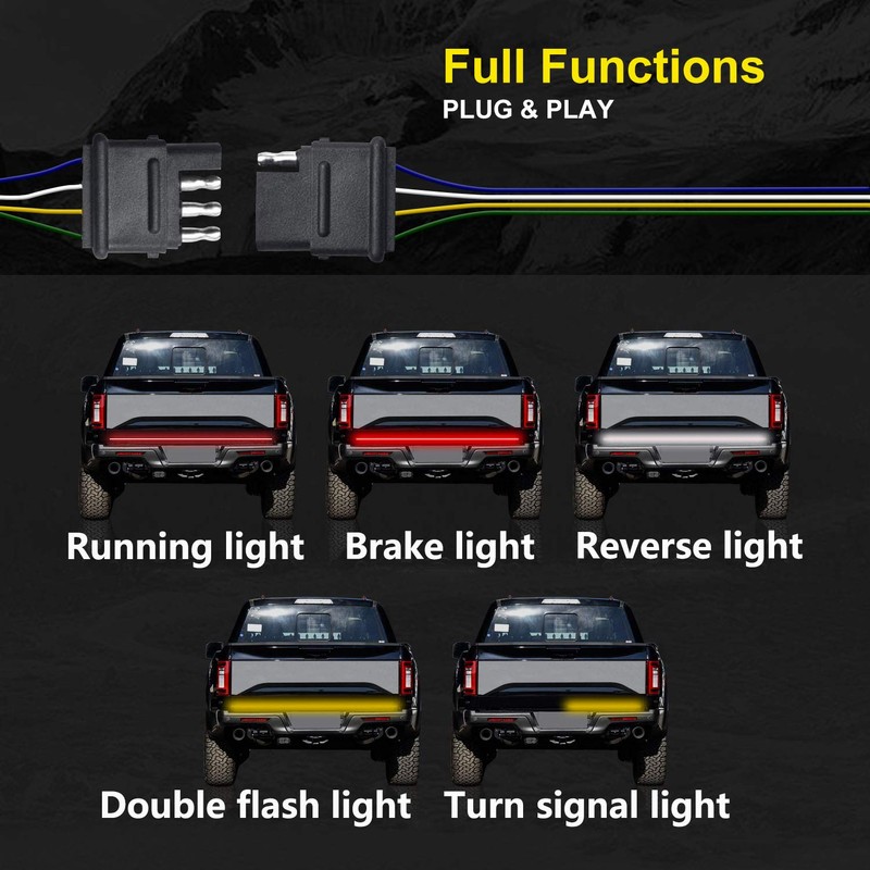 - 【Quick Installation & Waterproof IP67】: No Drill Install. Self-adhesive genuine 3M tape and well conductive standard 4-pin flat plug can easily stuck on where you need.The LED Tailgate Light Bar with IP67 waterproof rate ,works good whatever in rainy or snowy days.With inline fuse for short circuit protection,the truck tailgate bar can be super durable.