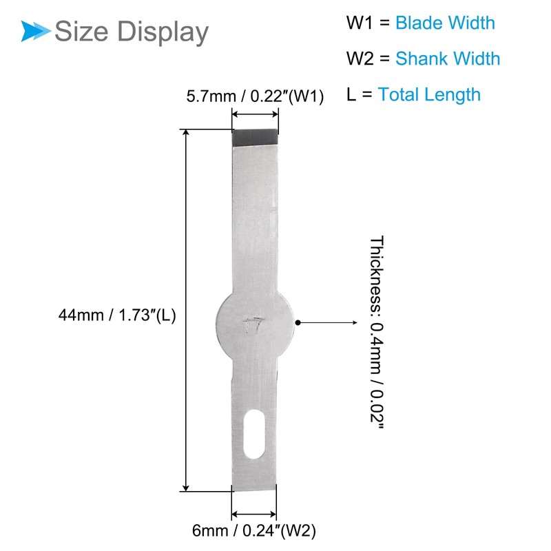 - ★ Precision Knife Blades Size --- Blade width: 10mm / 0.39"; Shank width: 6mm / 0.24"; Total length: 38mm / 1.5"; Thickness: 0.4mm / 0.02".