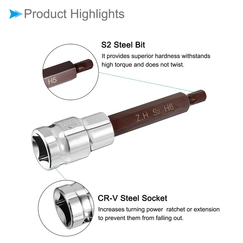 --- The Hex Bit Socket is made of S2 alloy steel with high hardness and strong rust resistance. The chromium-vanadium steel sleeve increases the rotation power.