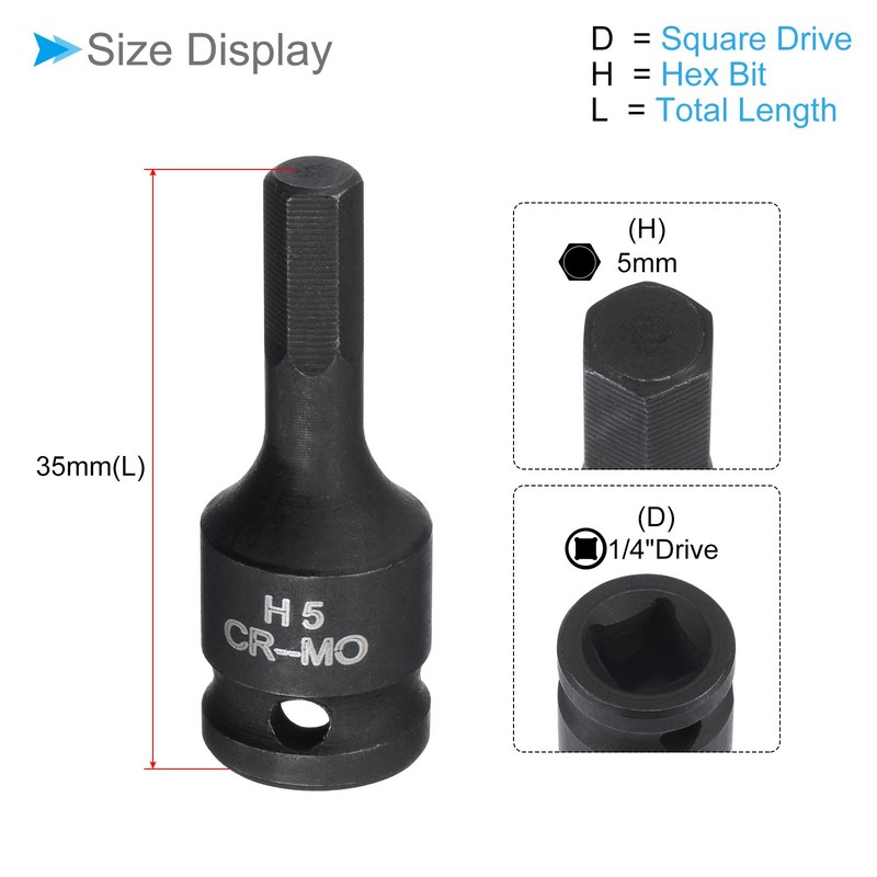 - ★ Hex Bit Socket Size --- The overall length of the socket is 35mm, 1/4 inch in square drive, 5mm in hex bit size.