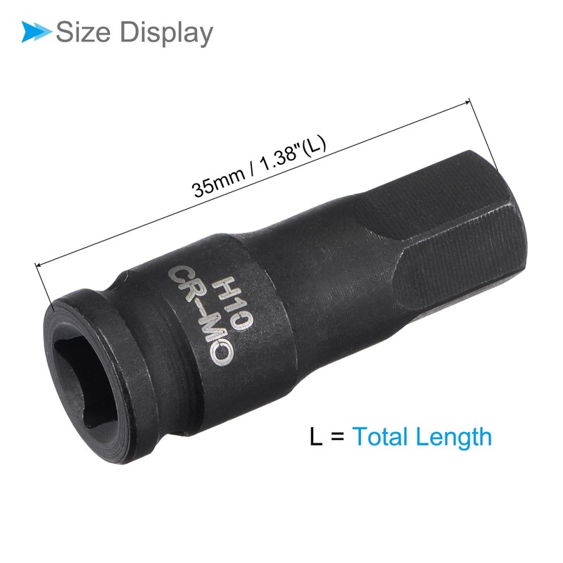 - ★ Impact Socket Size --- Driver Size: 1/4 Inch; Bit Size: 10mm (H10); Total Length: 35mm / 1.38 Inch. With a rounded corner design to reduce wear on the fastener.