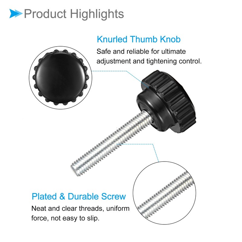 ---Knurling surface of knob provides a non-slip grip even with gloves or wet hands. Knurled clamp knob has threaded studs that attach to the opposite component for quick and easy installation. Made of durable plated carbon steel and thermoset plastic for long lasting performance and abrasion resistance. Well-plated steel metal insert hand screws allow adjustment without additional tools. Thumbscrews provide an easy and reliable way to control component adjustment and tightening.