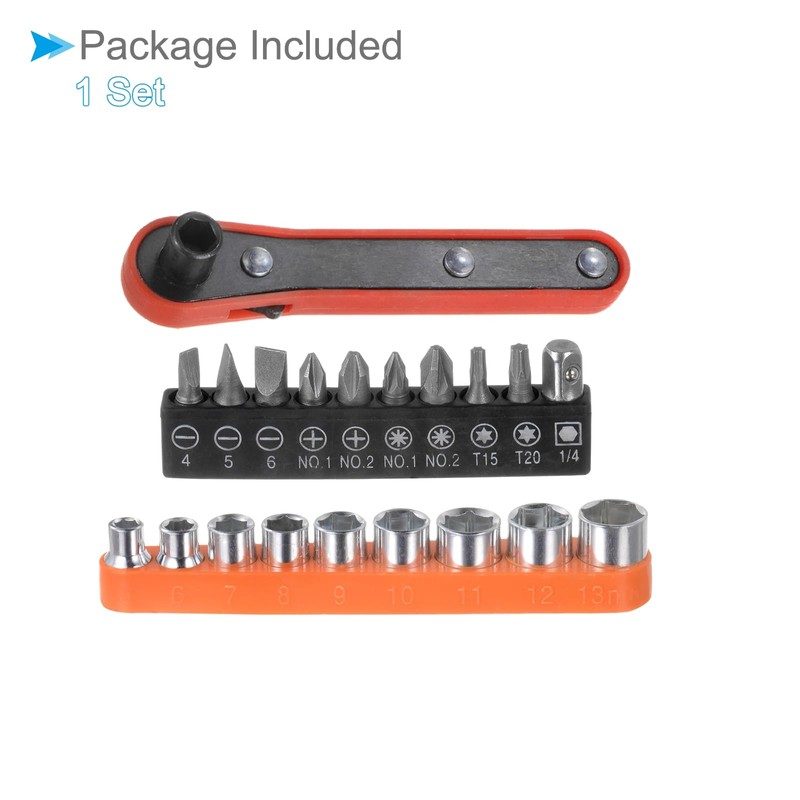 • ★ Screwdriver Bit Size --- Slotted Tip Size: 4mm, 5mm, 6mm; Phillips Tip Size: PH1, PH2; Torx Tip Size: T15, T20; Tip Size: PZ1, PZ2; Square Tip Size: 1/4; Bit Length: 25mm / 1"; Socket: 5mm, 6mm, 7mm, 8mm, 9mm, 10mm, 11mm, 12mm, 13mm; Ratchet Wrench Length: 100mm / 4"