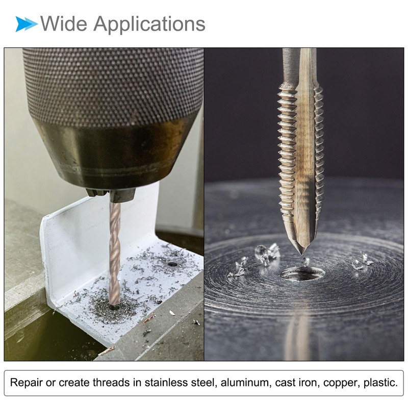 - ★ WIDE APPLICATION --- Repairs damaged thread threads of stainless steel, aluminum alloy, cast iron, copper, iron, aluminum, plastic or create new screw threads. These taps are used to place female threads into through or shallow stop holes such as nuts, screw inserts, pipes, valves, parts, furniture, etc
