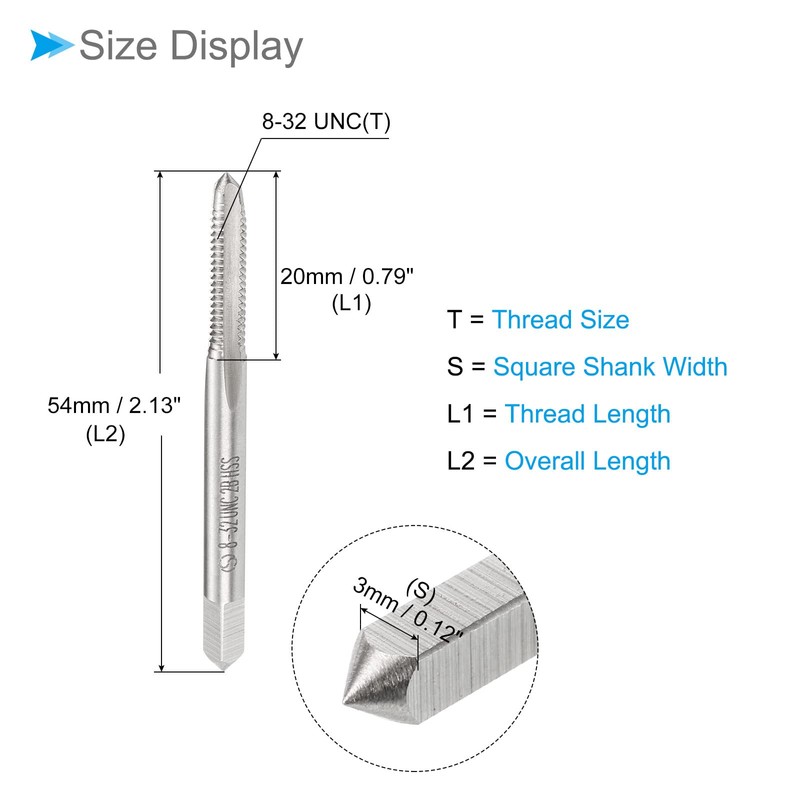 • ★ Thread Tap Size --- Thread size: 8#-32 UNC (right hand); square shank width: 3mm / 0.12"; thread length: 20mm / 0.79"; overall length: 54mm / 2.13"; accuracy: 2B; flutes quantity: 3 flutes.