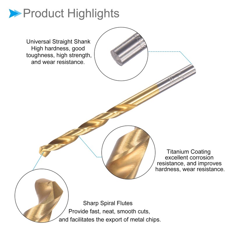 --- The straight shank twist drill is made of high-speed steel 6542, with high hardness, good toughness, high strength, and wear resistance. Titanium coating has excellent corrosion resistance, greatly improves hardness, wear resistance, and reduces the coefficient of friction. Sharp spiral flutes provide fast, neat and smooth cuts. The spiral groove facilitates the export of metal chips, which saves time and effort in operation.