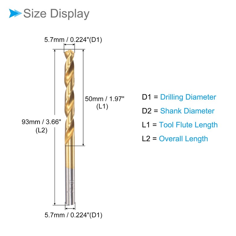 • ★ Twist Drill Bit Size --- Drilling diameter: 5.7mm / 0.224"; tool flute length: 50mm / 1.97"; shank diameter: 5.7mm / 0.224"; overall length: 93mm / 3.66"; tool flute type: spiral; hardness: HRC63-66; processing technology: fully ground & rolling