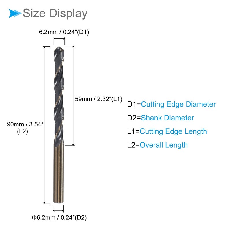 • ★ Drill Bit Size --- Cutting edge diameter: 6.2mm / 0.24"; shank diameter: 6.2mm / 0.24"; cutting edge length: 59mm / 2.32"; overall length: 90mm / 3.54"; shank type: round shank