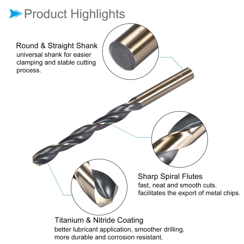 --- The straight shank drill is made of 4341 high-speed steel, with high hardness, good toughness, high strength, and high wear resistance. The dual coating of gold titanium and black nitride provides better lubricant application, smoother drilling, and is more durable and corrosion resistant than regular black surfaces. Sharp spiral flutes provide fast, neat and smooth cuts. The spiral groove facilitates the export of metal chips, which saves time and effort in operation.