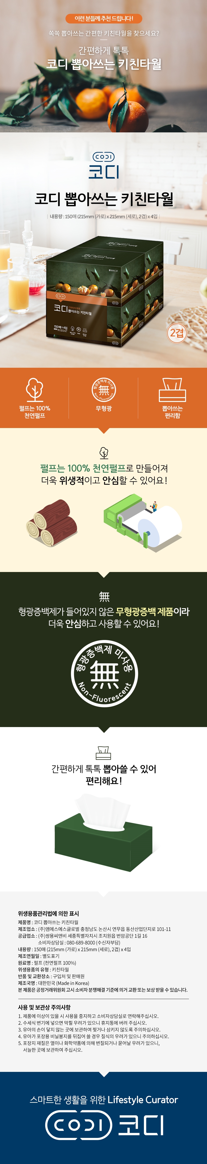 CODI Ssangyong C&B CODI reusable kitchen towels 150 sheets, 4 packs, 1 pack, 2 packs, 4 packs, 8 packs in box, 150 sheets x 4 packs, 2 packs / 코디 쌍용씨앤비 CODI 뽑아쓰는 키친타월 150매 4입 1팩 2팩 4팩 8팩인박스, 150매x4입2팩