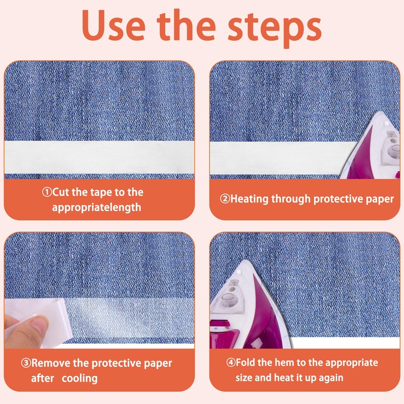 - Easy to Use: First cut fusible no sew hem adhesive tape to the needed length, then stick the adhesive side to the fabric, peel off the backing and stick the other side of the fabric, use an iron for about 10-15 seconds, ironing temperature 130-150 degrees.