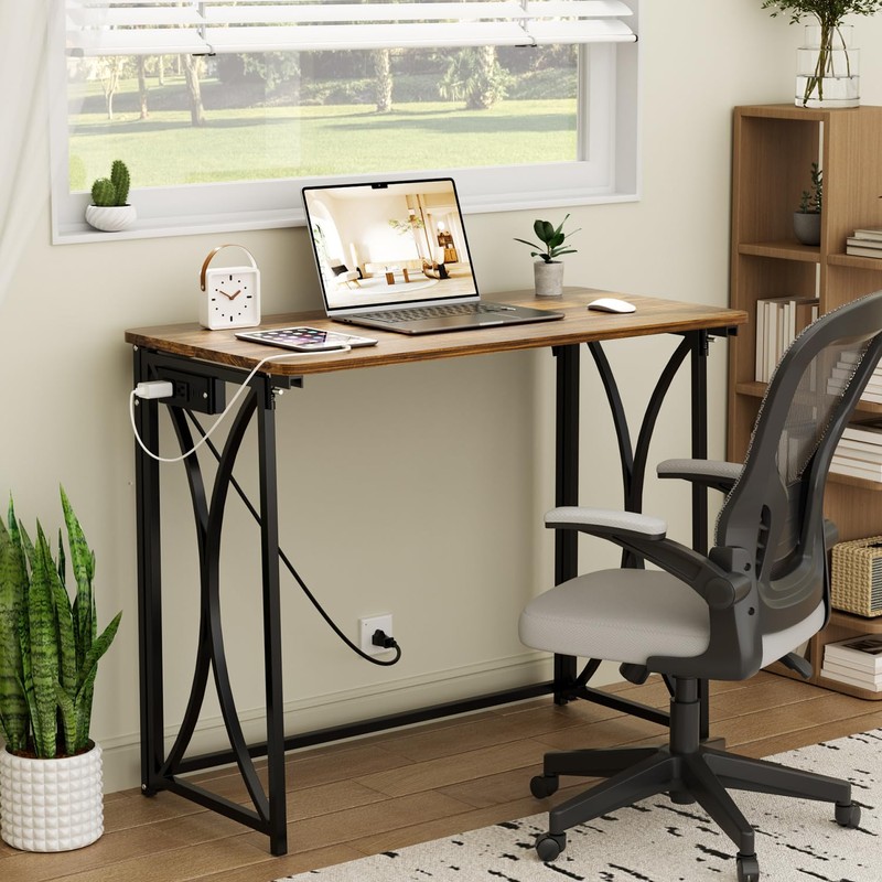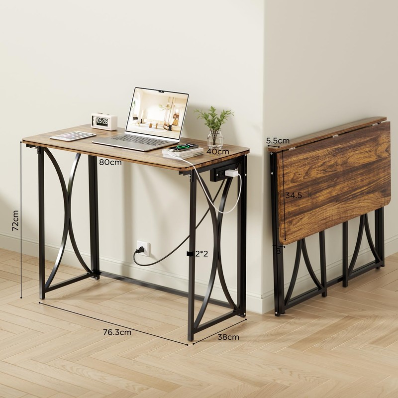 coeztt Small Desk, 31.5" Folding Table for Bedroom with Power Outlet, Space Saving Folding Computer Desk for Home Office, Easy Assembly, Brown