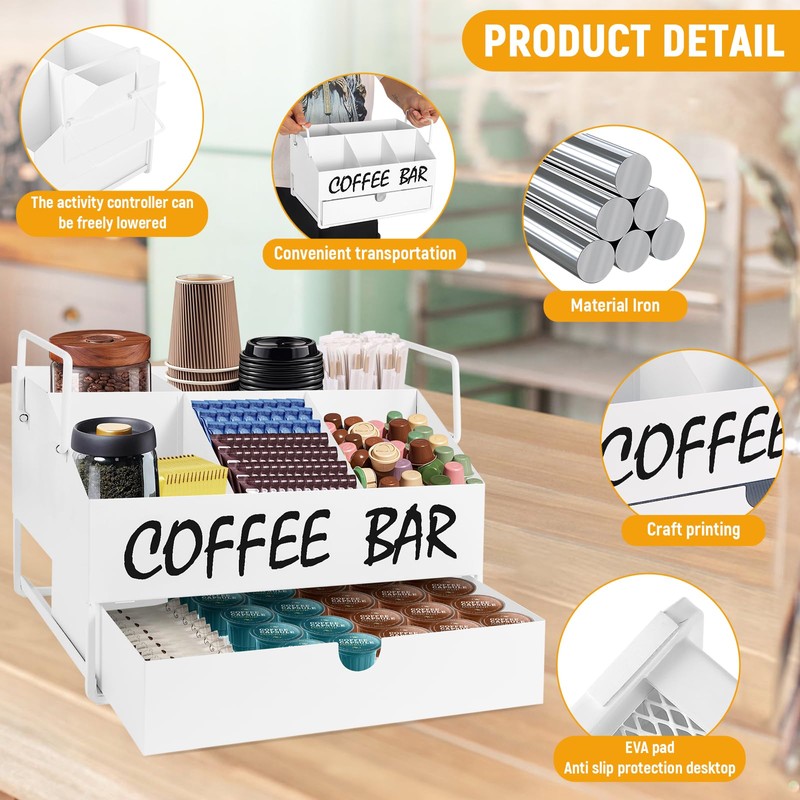 - 【Coffee Organizer Station for Coffee Room Decor】This coffee bar accessories and organizer is not only perfect for coffee essentials storage, it is also an charming coffee bar centerpiece. Featuring a painted ""Coffee Bar"" lettering, give this wooden coffee pod storage box a cafe atmosphere and makes a great addition to your coffee station decor